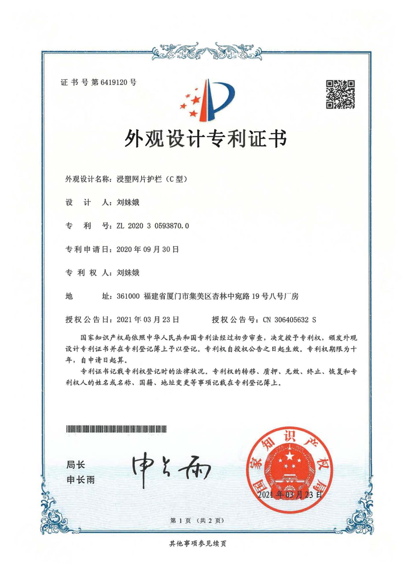專利證書-浸塑網(wǎng)片護欄C型
