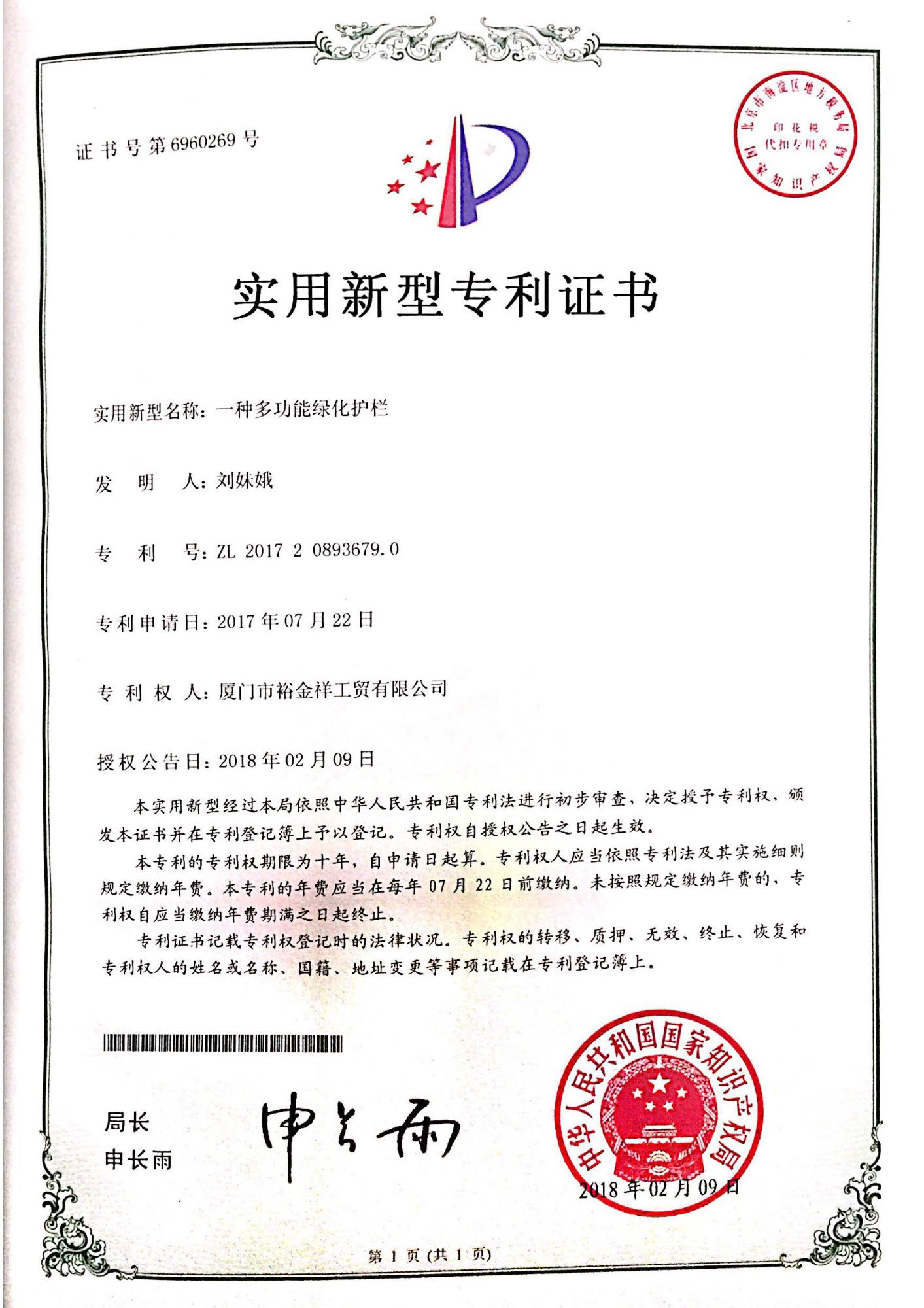 專利證書-多功能綠化護欄